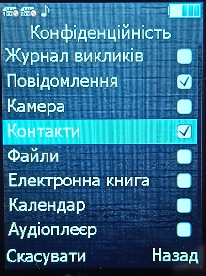 При налаштуванні є можливість встановити пароль для перегляду деяких розділів телефону (наприклад перегляд телефонної книги, журналу викликів, смс тощо).