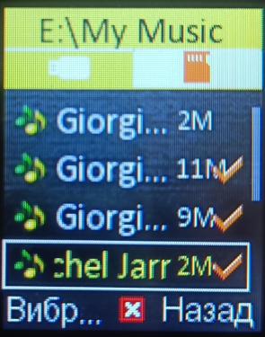 Знайдіть папку з музичними файлами. Для додавання декількох файлів на кожному (для вибору) натисніть центр клавішу. Після вибору натисніть Вибрати |