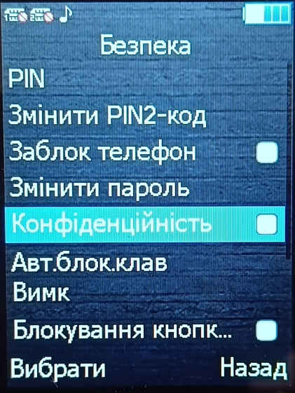 При налаштуванні є можливість встановити пароль для перегляду деяких розділів телефону (наприклад перегляд телефонної книги, журналу викликів, смс тощо).