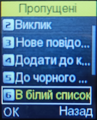 Також додати номери в БС можна безпосередньо з журналу викликів. Для цього прейдіть в Меню, оберіть Журнал викликів, натисніть ОК (або центр клавішу) |